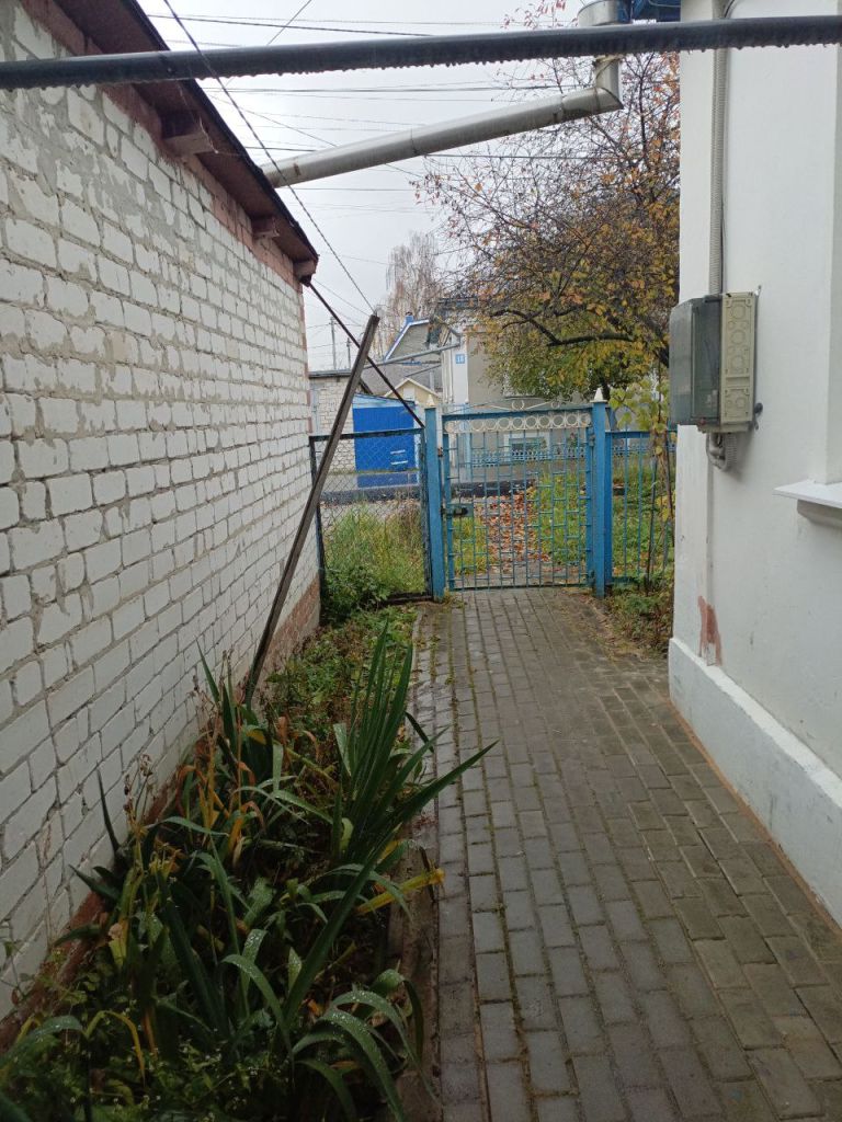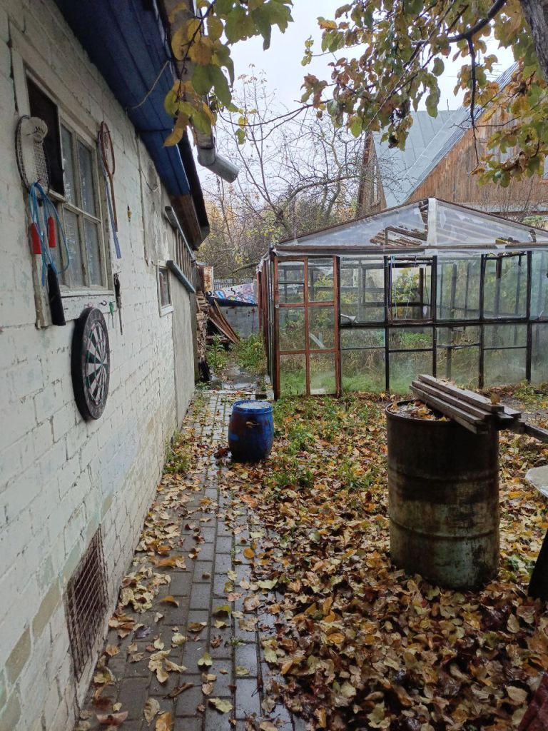 Участок 2,4 сотки, перед домом и сбоку, огорожен забором, посадки малины, яблоня, огромная стеклянная теплица, дорожка до дома выложена тротуарной плиткой.