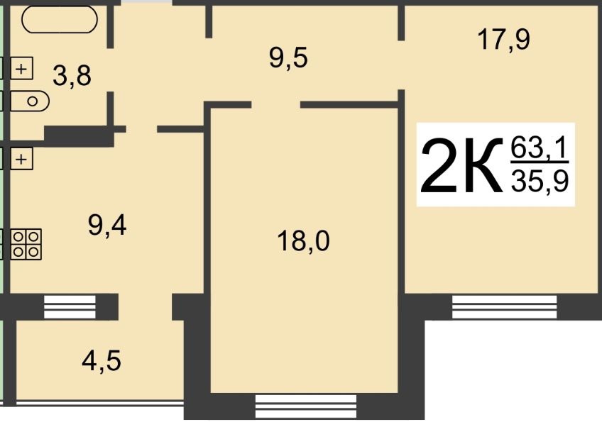 Площадь (кв.м.) | Общая: 58.7 Жилая: 36.1 Кухня: 9.8 Комнаты: 18+18.1 58.7 / 36.1 / 9.8 |