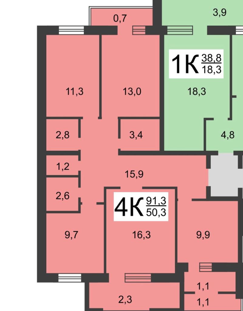| Площадь (кв.м.) | Общая: 91.3 Жилая: 50.3 Кухня: 9.7 91.3 / 50.3 / 9.7 |