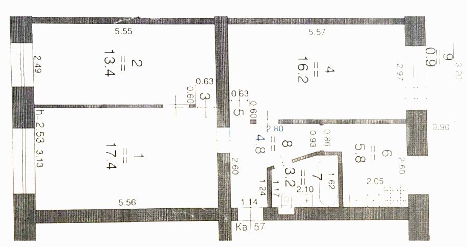 Площадь (кв.м.) | Общая: 63 Жилая: 47 Кухня: 5.8 Комнаты: 17.4+16.2+13.4 63 / 47 / 5.8 |