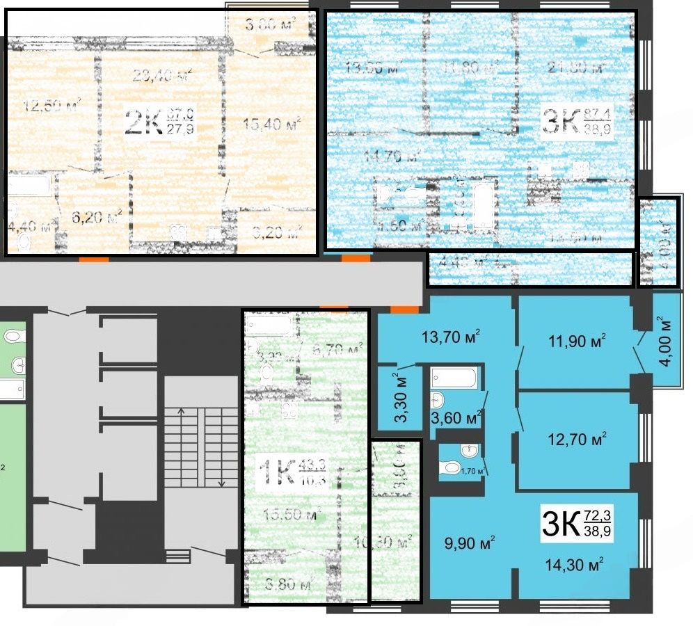 Площадь (кв.м.) | Общая: 72.3 Жилая: 38.9 Кухня: 9.9 72.3 / 38.9 / 9.9 |