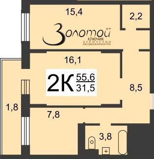 | Площадь (кв.м.) | Общая: 55.6 Жилая: 31.6 Кухня: 8 Комнаты: 16+15 55.6 / 31.6 / 8 |