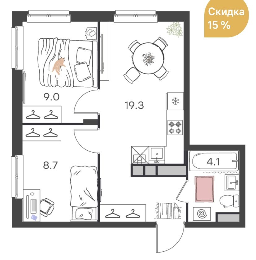 Площадь (кв.м.) | Общая: 41.1 Жилая: 17.7 Кухня: 19.3 Комнаты: 9+8.7 41.1 / 17.7 / 19.3 |