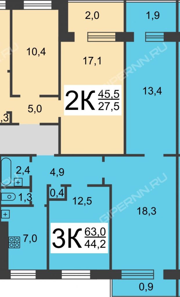 Площадь (кв.м.) | Общая: 63 Жилая: 44.2 Кухня: 7 Комнаты: 12.5+13.4+18.3 63 / 44.2 / 7 |