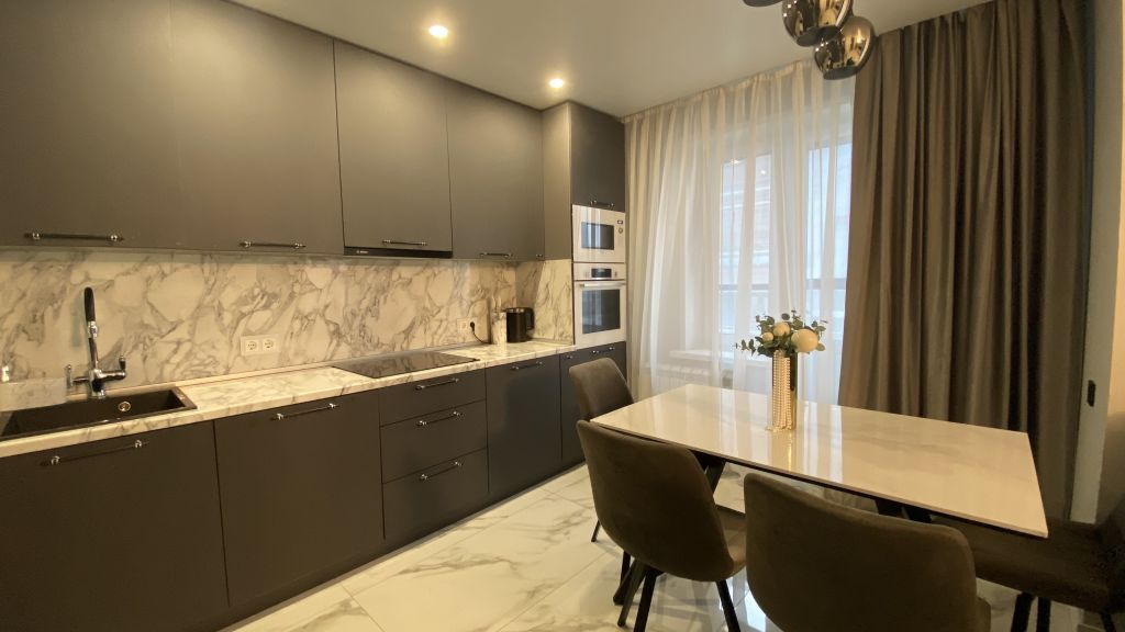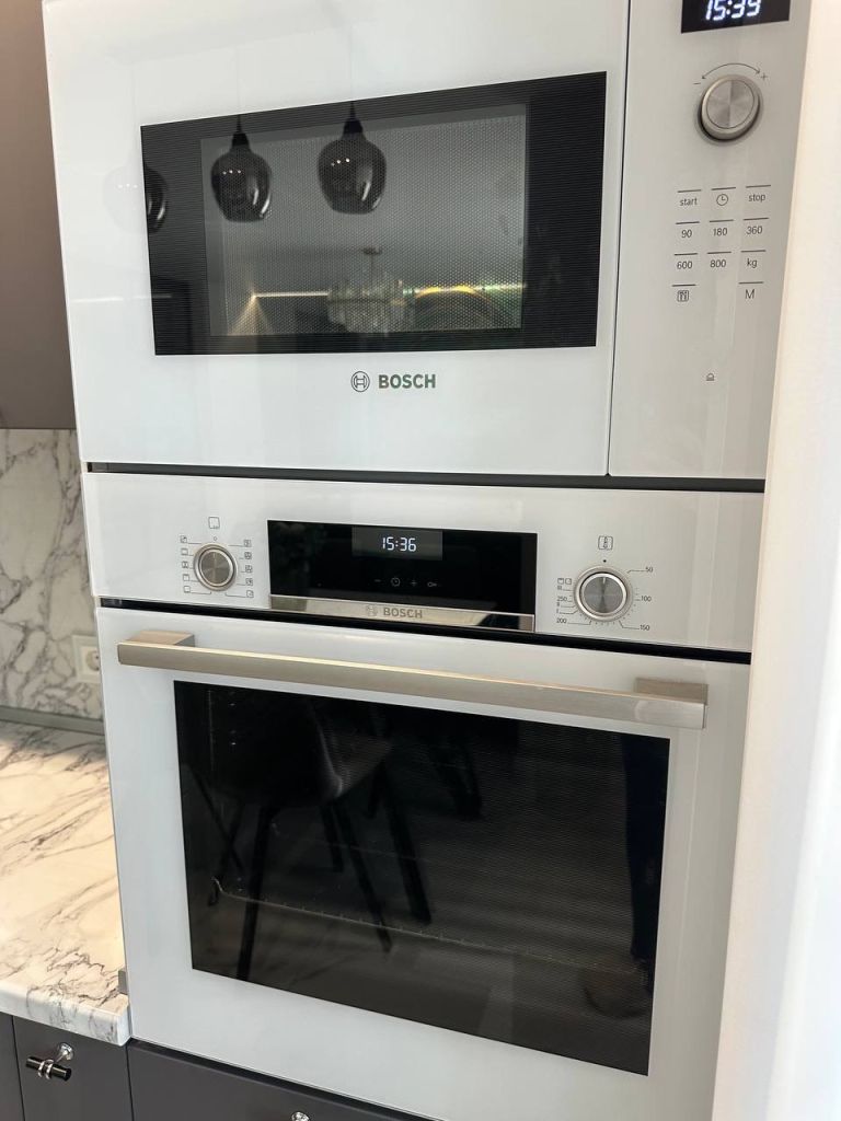 Кухня - гостиная оснащена бытовой техникой фирмы BOSH: СВЧ, вытяжка, индукционная варочная панель, духовой шкаф, холодильник, посудомоечная машина.