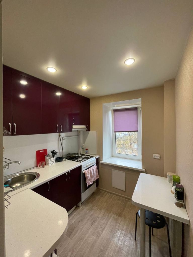 В квартире косметический ремонт. На полу линолеум, санузел отделан плиткой-мозаикой. Установлены пластиковые окна. Остается кухонный гарнитур.
