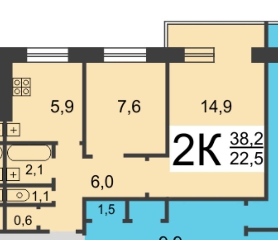 | Площадь (кв.м.) | Общая: 38.5 Жилая: 22 Кухня: 6 Комнаты: 8+14 38.5 / 22 / 6 |