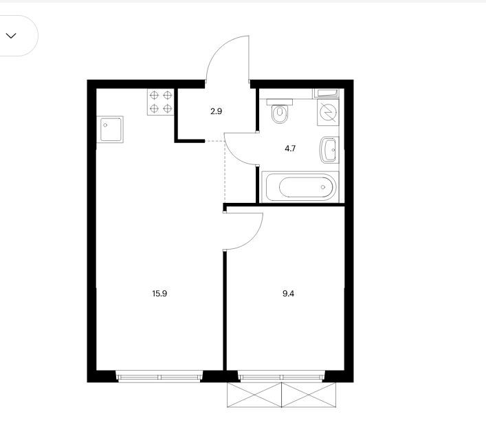 Площадь (кв.м.) Общая: 32.9 Жилая: 9.4 Кухня: 16.1 32.9 / 9.4 / 16.1