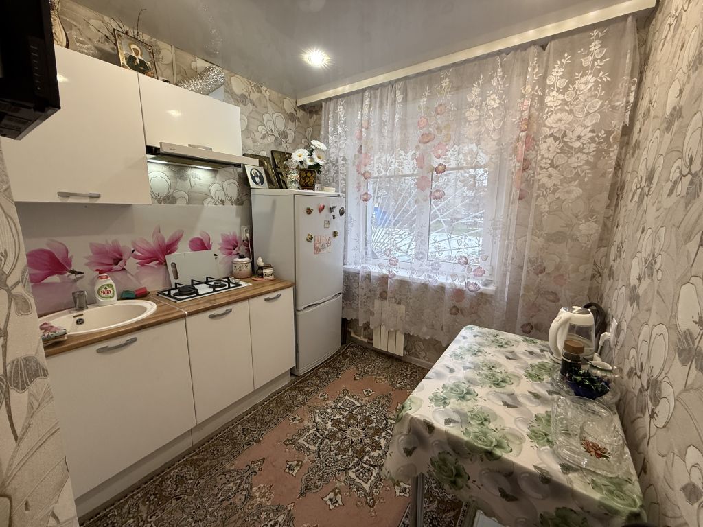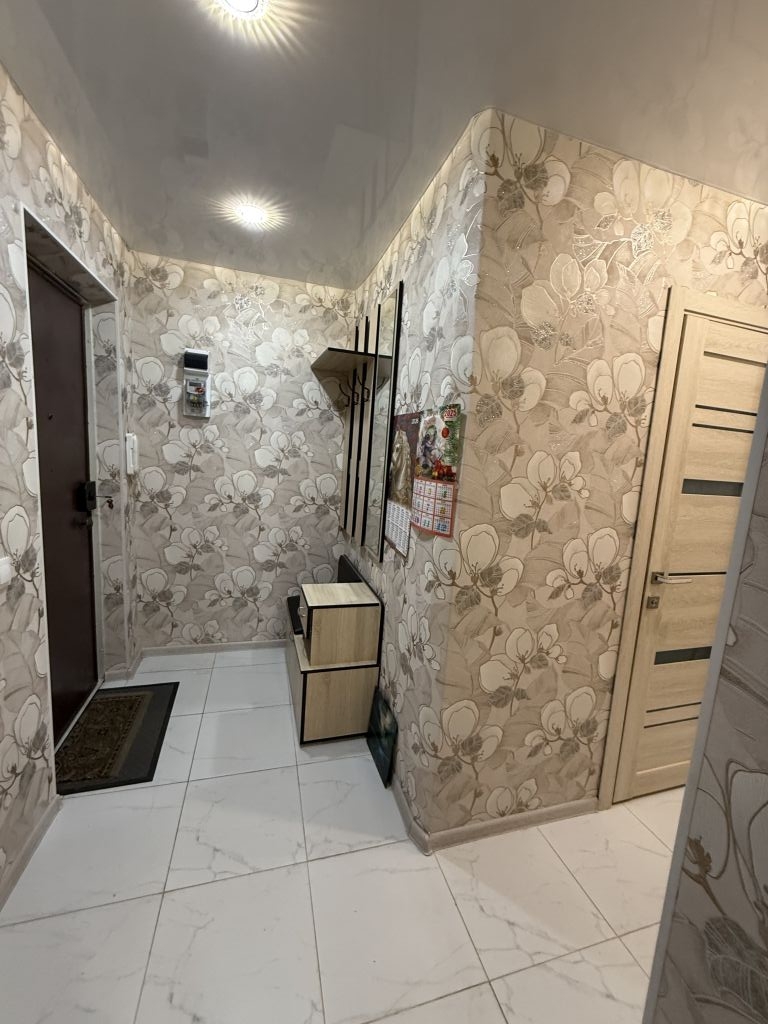 Квартира очень теплая и светлая. Все двери заменены, полы и стены выровнены, в прихожей и на кухне на полу плитка, в   комнате-ламинат,   заменена вся проводка, электрические розетки и выключатели современные, в рабочем состоянии, везде натяжной потолок со спотами, установлены новые радиаторы отопления, которые можно регулировать. Все окна новые- ПВХ, выходят во двор, солнце в первой половине дня. Из комнаты выход на просторную лоджию, дверь с остеклением в пол.   На лоджии имеется оборудованный кирпичный погреб для хранения заготовок и овощей.